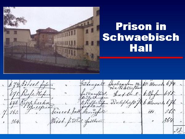 As the first child of Jacob and Margaretha was born in Kreuzfeld on 2 November 1864, the newlyweds must have moved immediately to Kreuzfeld upon their marriage. Little is known of the lives of the Zeisset family at Kreuzfeld. Jacob was a "Gutspaechter", the lessee of an estate. Margarethe was kept busy having children, as she had a baby every year until 1872 (1864, 1865, 1866, 1867, 1868, 1869, 1870 and 1871). Then she had Georg Jakob in 1873, Barbara in 1875 and Henry in 1878 and the last baby in 1881, who was premature. The death record of Margarethe in the Schrozberg church book states that she died on the 20 th of February 1881 at seven o'clock in the morning from a difficult childbirth. She was buried at Crailshausen at 1:30 in the afternoon two days later. The German church records often contain a "Family book" in addition to the separate baptism, confirmation, marriage and death books. The family book lists each family of the church, with the husband and wife at the top, their parents and then their children below. The family book for Kreuzfeld notes the death of Jacob on 6 October 1884 from typhus in the Landesgefaengnis (state prison) at Hall. It also states that he does not belong to the local population.